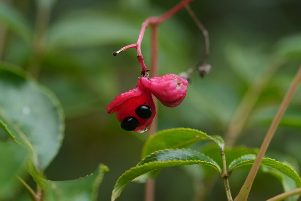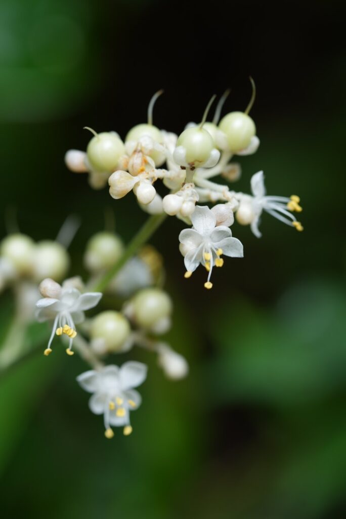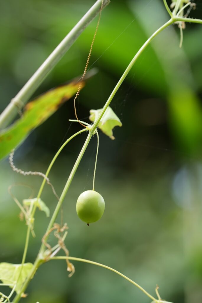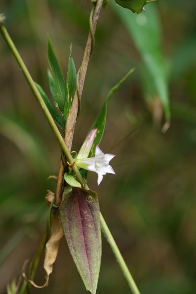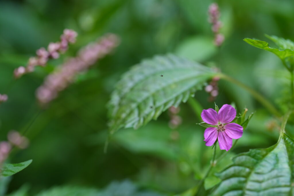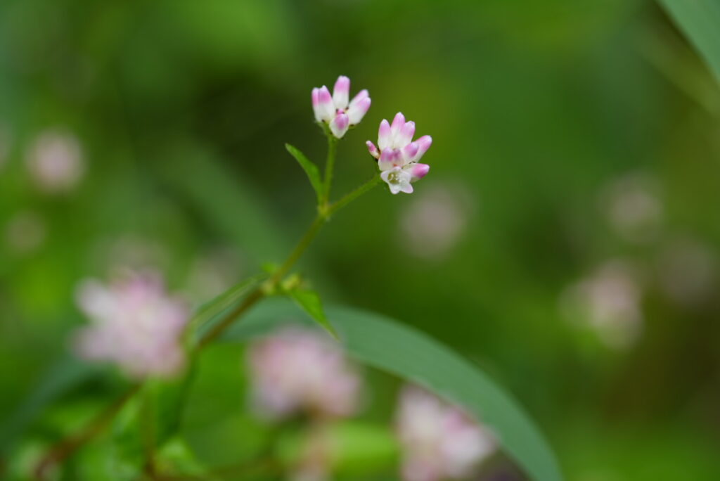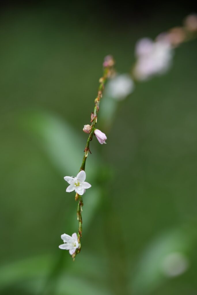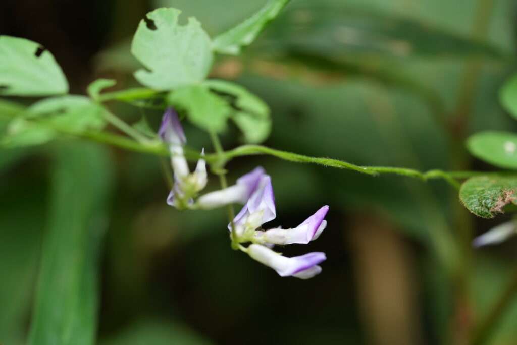 観察を始めてすぐに出会ったのは小さなヤブマメの花、濃い紫の実をつけたヤブミョウガ、薄緑の丸い実のスズメウリ、アザミ、ゲンノショウコ、ハナタデ、イヌホウズキ…
