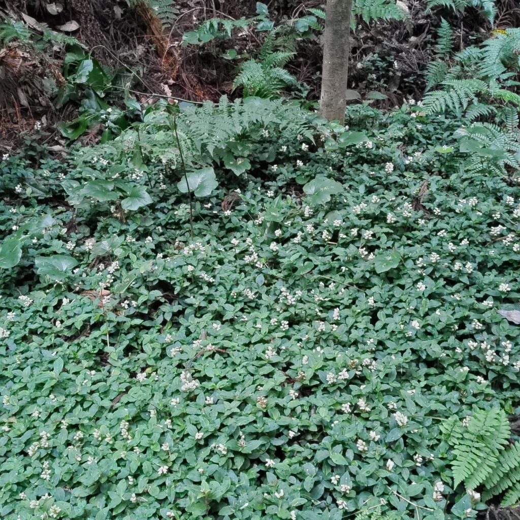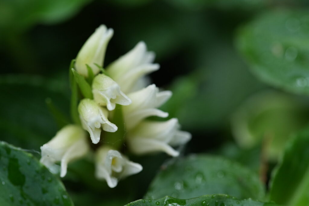 アケボノシュスランは薄暗い谷筋沿いに広がって咲いていました。薄いピンクがかった白い花と濃い緑の葉っぱがかわいい。