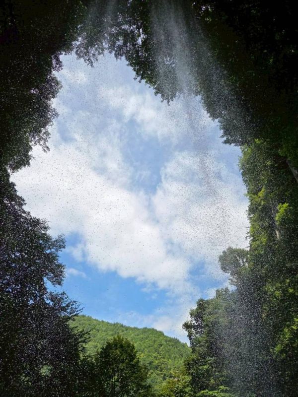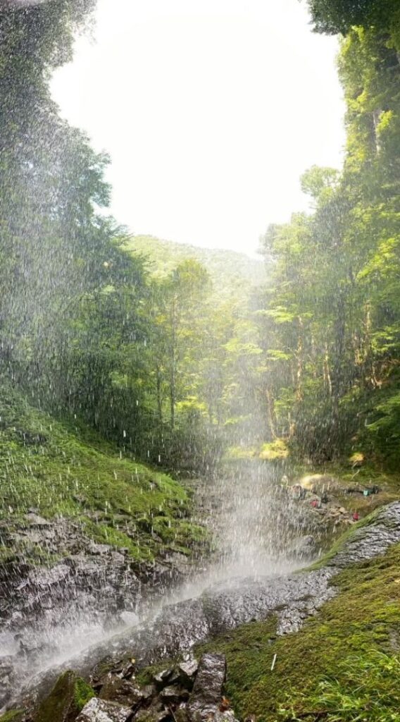 2番目は高さ70mの岩洞滝。樹林帯から突然現れる迫力ある大滝に思わず、おおっーと声が出てしまいます。滝の裏側に回り込んで見ることができ、飛び散るしぶきがとってもきれい。