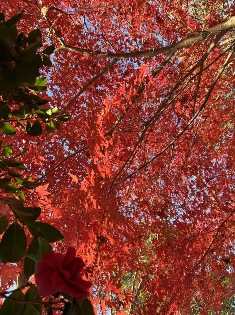 木々の間から差し込む日差しに照らされて、紅葉がいっそう鮮やかに見えます。