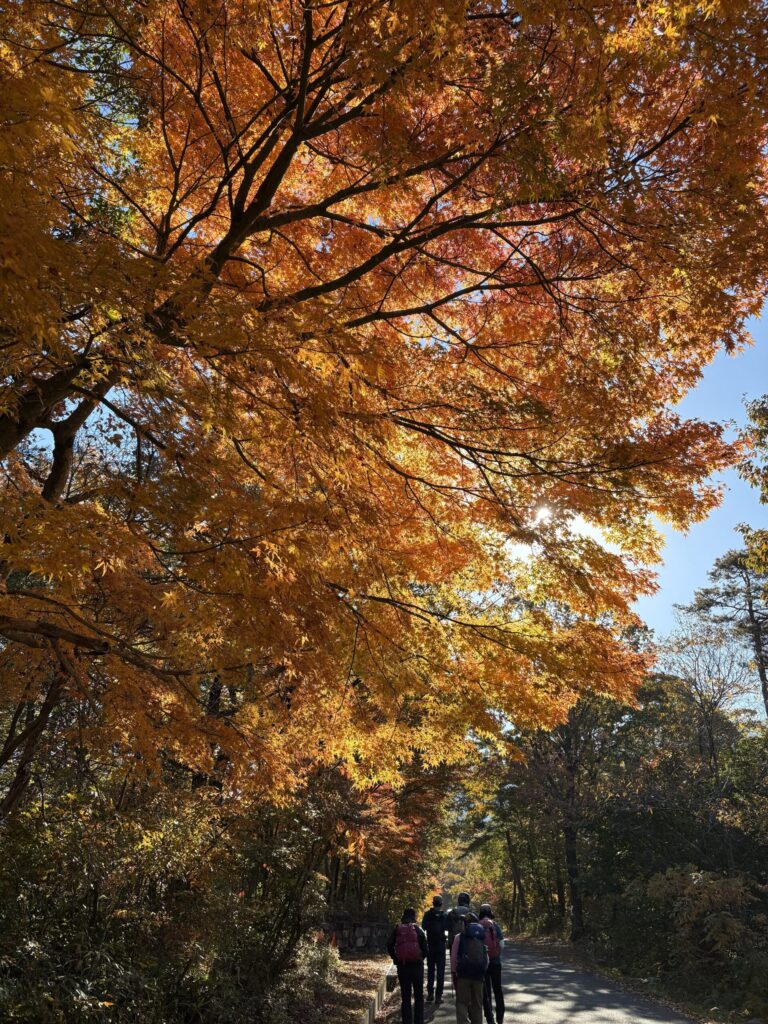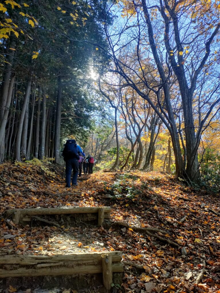 報告:早朝に出発して、紅葉を期待しながら3つの乗り物を乗り継いで登山口に到着したのが9時半過ぎ。当日は帰りのバスダイヤの関係で時間の余裕があると判断し、全員スローペースでの山行となりました。頂上までほとんど急登の連続ですが休憩をとる時間を十分確保できたので、皆が周りの景色、紅葉を楽しむ余裕があったようです。