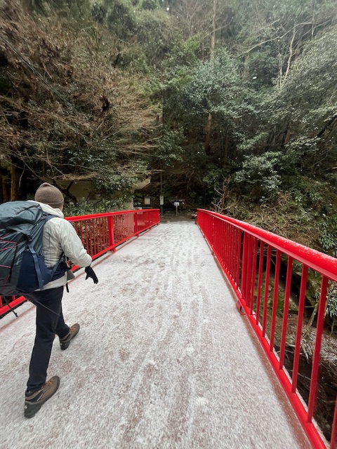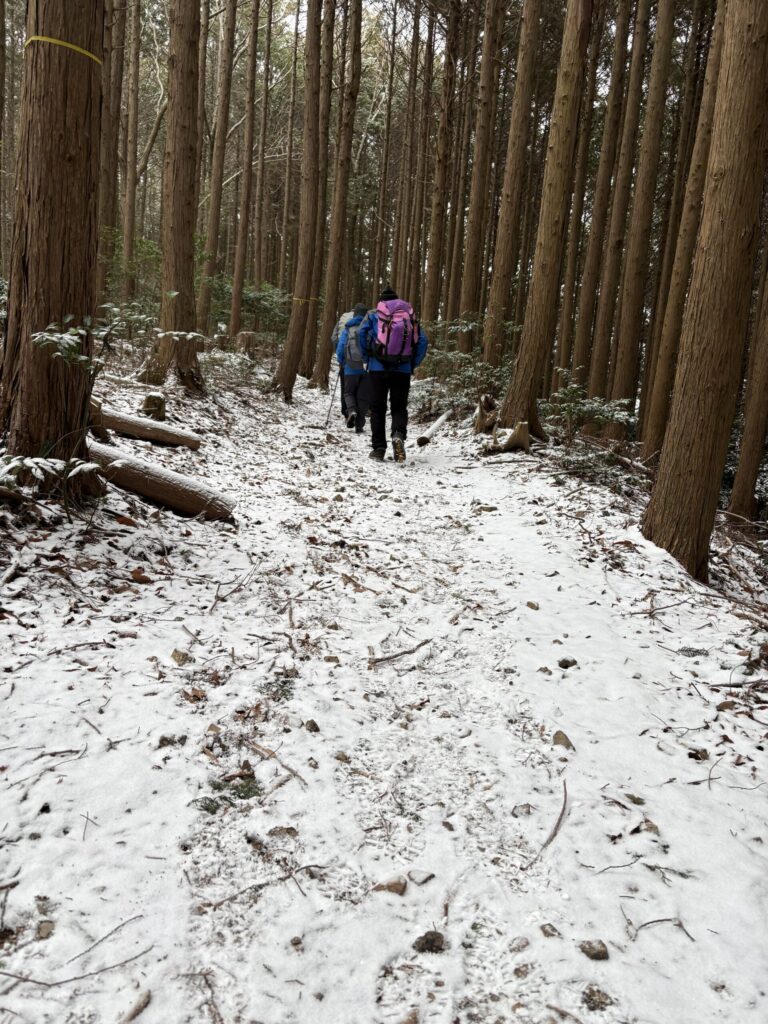参加者感想:1月に入会して初めての山行に参加させていただきました。雪はほとんど一日中降り続き、いつもの箕面とは違う静けさに包まれた特別な景色を味わえました。歩調にもこまめに気を配っていただき急な下りではチェーンスパイクも貸していただき初めての装備に少しワクワクしながら進みました。歩行中は風がほとんどなかったので寒さはそれほど感じませんでしたが勝尾寺園地での昼食時は厳しい冷え込みでスープが一瞬で冷めるほどでした。帰り道では、この日一番の吹雪に見舞われ目を開けるのも大変でした。寒い一日でしたが皆さんとのお話がとても楽しく心に残る初山行となりました。